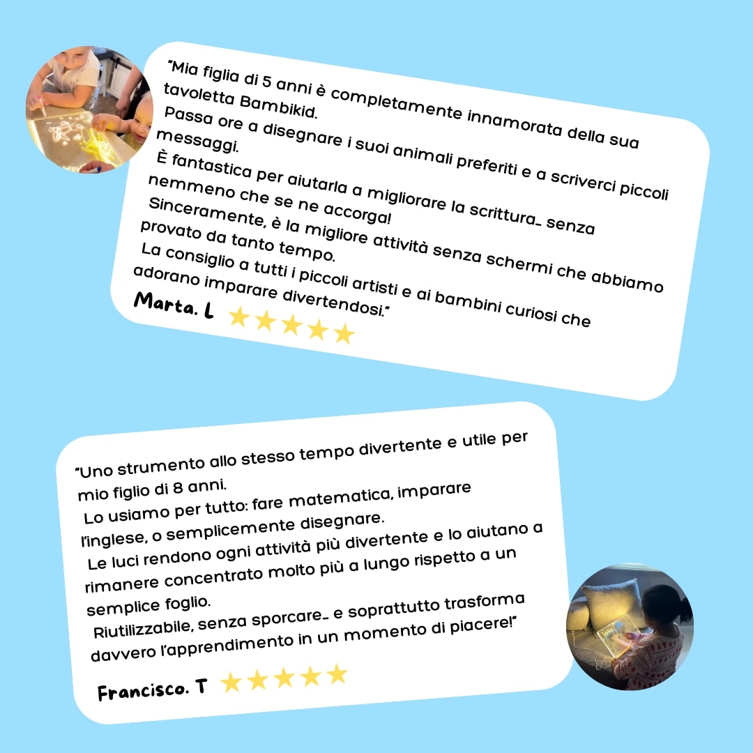 “La Tavoletta Luminosa è molto più di un semplice gioco: aiuta i bambini a sviluppare la motricità fine, la concentrazione e la creatività, il tutto senza l’uso di schermi. È un valido strumento educativo che consiglio spesso ai genitori.”